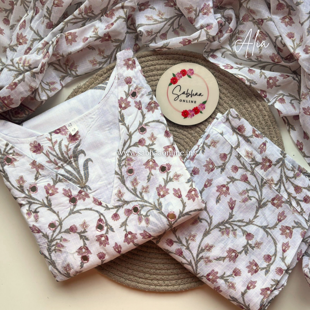 Alia - Off White Sanganeri Cotton kurti 3pc set with lining - LN 32
