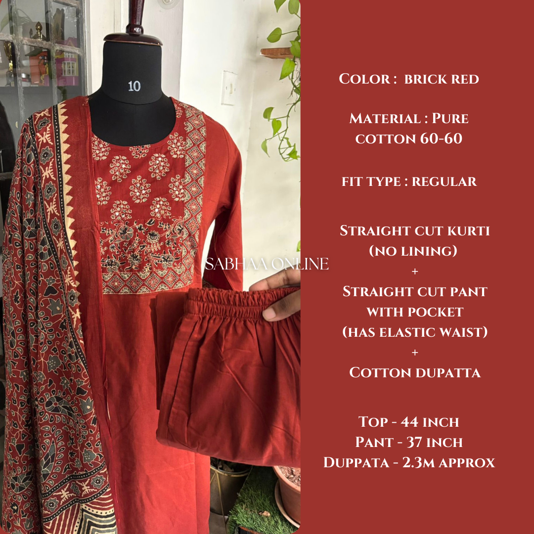 Rana - Brick red Solid + Ajrak printed Cotton Kurti 3pc set