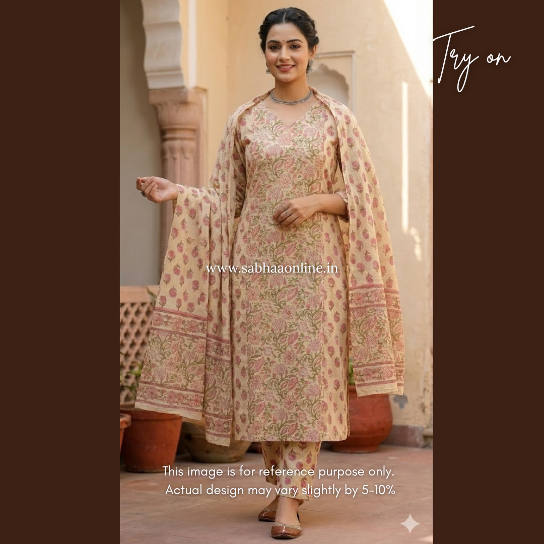 Sana - Cream and pink Cotton kurti 3pc set with lining - LN20
