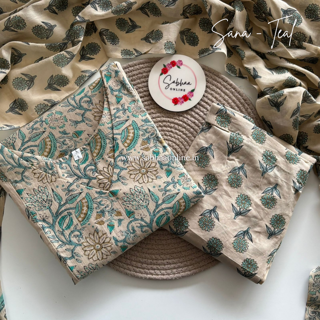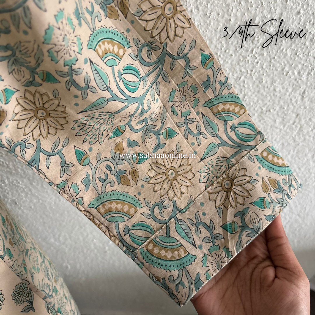 Sana - Cream and Teal Cotton kurti 3pc set with lining - LN26